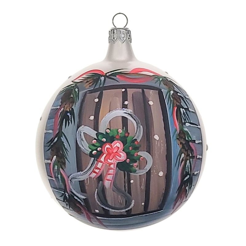 This blown glass ornament shows a Gingerbread man painted on a door on a matte white ball.