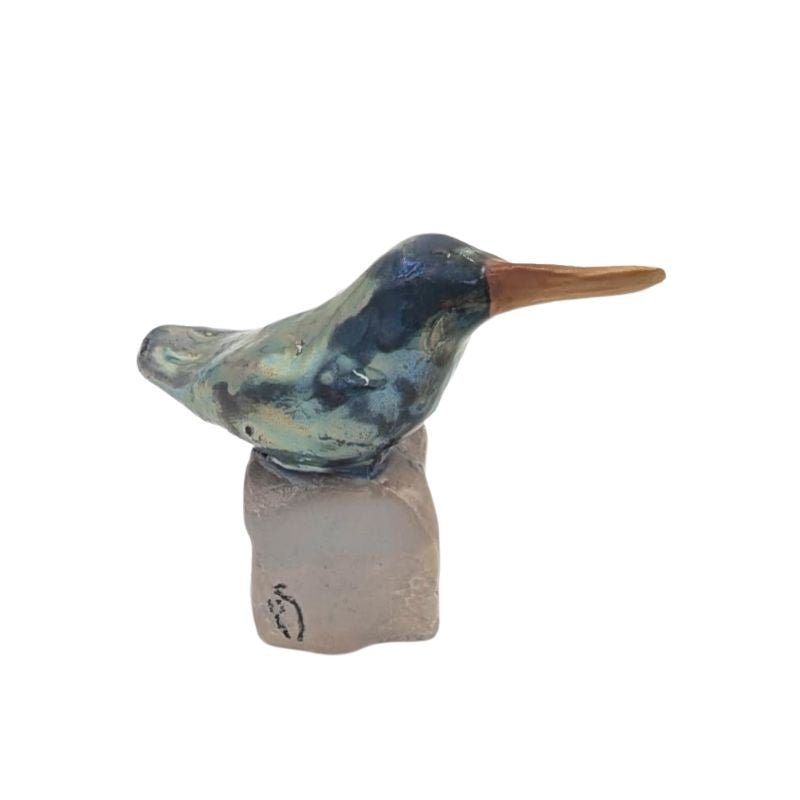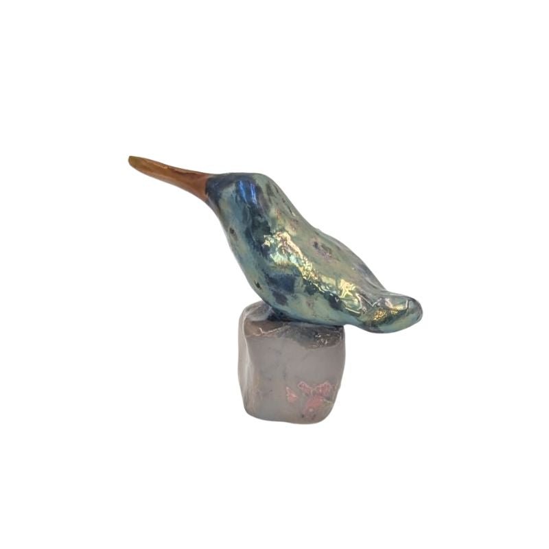 This one-of-a-kind hummingbird figurine is painted in blue and green finished with an iridescent glaze. Handcrafted and uniquely detailed, each piece captures the delicate shimmer of light and color. Style it on a bookshelf, console table, or mantel to bring a touch of elegance and artistry to any space.
