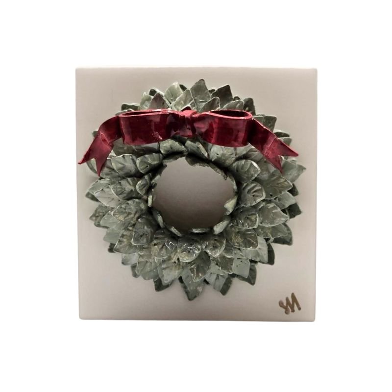 This mixed media piece features a hand-sculpted green wreath with a red bow, crafted from polymer clay and sealed in clear resin, set on a natural hardwood base painted white. Hardware is included for easy wall hanging.