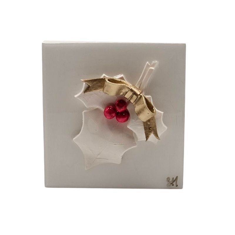 This mixed media piece features a hand-sculpted white holly leaf with red berries and a white bow, crafted from polymer clay and sealed in clear resin, set on a natural hardwood base painted white. Hardware is installed for wall hanging.